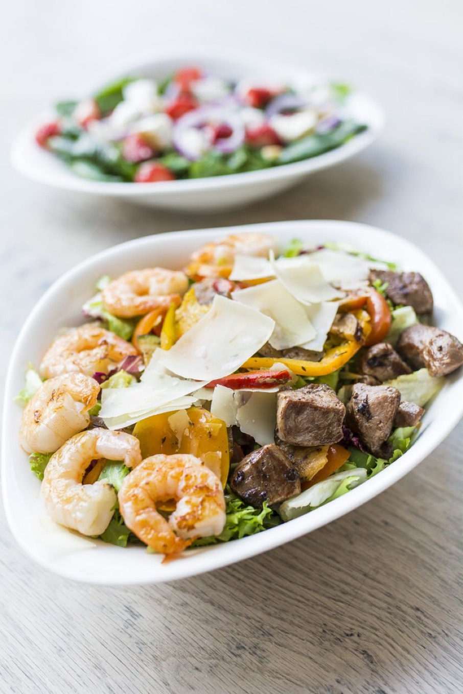 Grilled fillet of beef and king prawns, grilled mixed vegetables, cherry tomatoes, spring onions, mixed leaves, Italian hard cheese