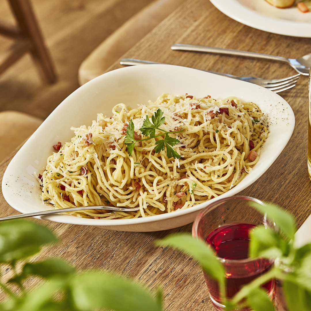 We make ours from high-quality durum wheat flour and water, in a variety of shapes – spaghetti, linguine, tagliatelle, campanelle, penne and fusilli.