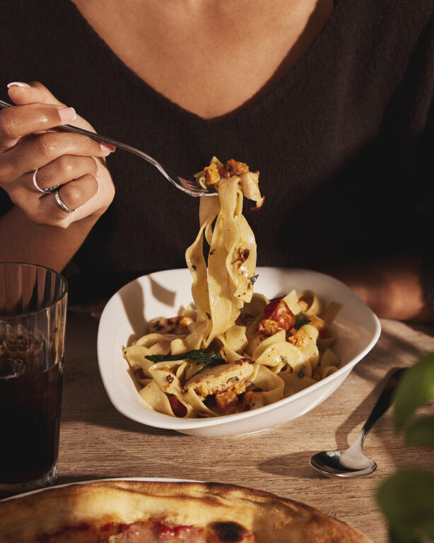 cestoviny, salsiccia, pečené paradajky a kocky tekvice, zmes húb (hliva ustricová a šampiňóny), cesnakový olej, smotana, taliansky tvrdý syr, rozmarín, šalvia
